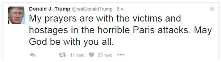 "Молюсь за всех жертв и заложников ужасного теракта в Париже. Храни вас всех Господь", - Дональд Трамп, политик