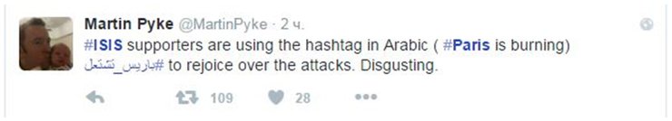 "Сторонники ИГИЛ используют арабский хэштег (#Париж в огне), чтобы ликовать по поводу нападений. Омерзительно", - Мартин Рик