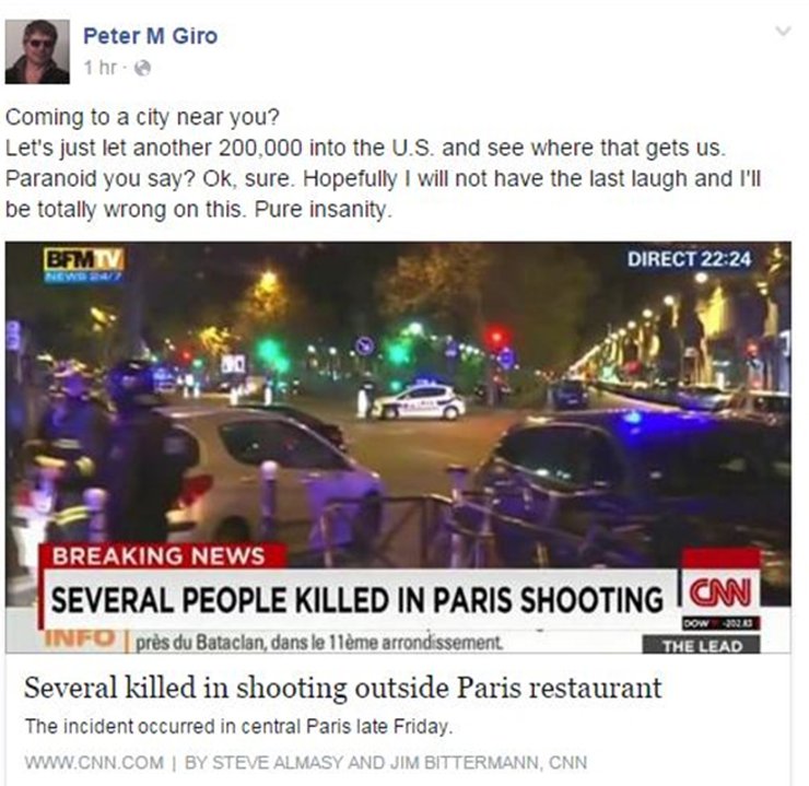 "Переезд в соседний город? Давайте просто впустим в США еще 200 000 (иммигрантов-мусульман. – Фокус) и посмотрим, что нас ожидает. У меня паранойя, говорите? Да, конечно. Надеюсь, мне не придется смеяться последним, и я окажусь совершенно неправ по этому поводу. Чистое безумие", - Петер Гиро