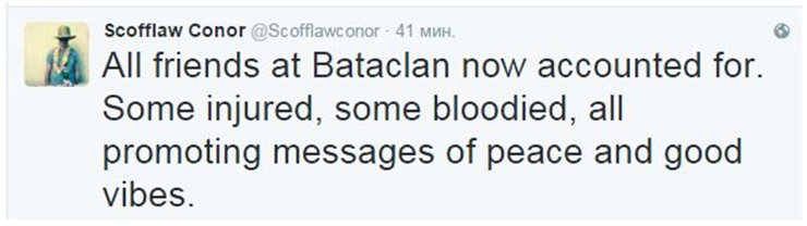 "Все мои друзья из клуба Батаклан уже спасены. Некоторые ранены, у некоторых кровотечение, все пишут сообщения о мире и позитивном",- Скофлав Конор