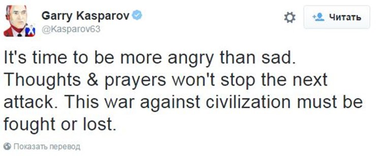 "Время не грустить, а злиться. Мысли и молитвы не остановят следующую атаку. Эту войну цивилизация либо выиграет, либо проиграет", - Гарри Каспаров