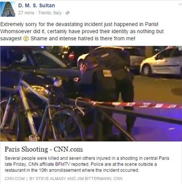"Мне очень жаль, что произошел этот разрушительный инцидент в Париже! Те, кто это сделал, кем бы они ни были, стопроцентно показали себя дикарями. Во мне смешались стыд и жгучая ненависть!", - Д. Султан