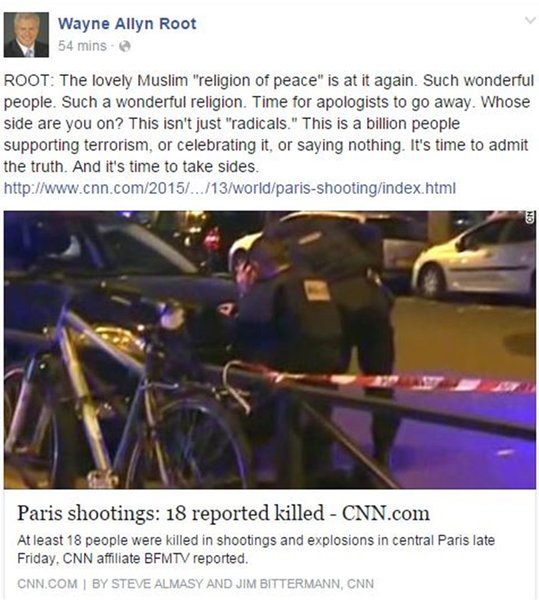 "Милая мусульманская "мирная вера" снова дарит мир. Какие прекрасные люди. Какая прекрасная вера. Тем, кто любит извиняться, время уйти в сторону. За кого вы? Это же не просто "радикалы". Это миллиард людей, поддерживающих терроризм, приветствующих его или не говорящих против него ни слова. Пришло время принять правду. Пришло время выбрать, на чьей вы стороне", - Вейн Рут, политик