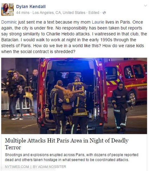 "Доминик написала мне, так как моя мама живет в Париже. Говорю еще раз, город в огне. Никто пока не берет на себя ответственность за случившееся, но, судя по репортажам, это очень похоже на нападение на Шарли Эбдо. Я работала официанткой в том клубе, в Батаклане. Приходилось пешком ходить на работу в начале 90-х. Как мы живем в таком мире? Как мы растим детей, если договоренность между мирами уничтожена бумагорежущей машинкой?", - Дилан Кендел