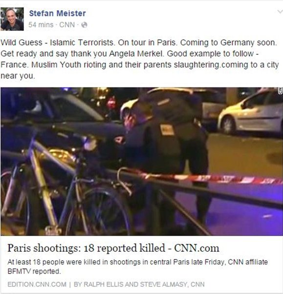 "Первое, что приходит в голову - исламские террористы. На гастролях в Париже. Далее - в Германию, в ближайшее время. Приготовьтесь и благодарите Ангелу Меркель. Хороший пример, Франция. Мусульманские беспорядки молодежи и их родителей - совсем скоро, в вашем городе", - Стефан Мейстер