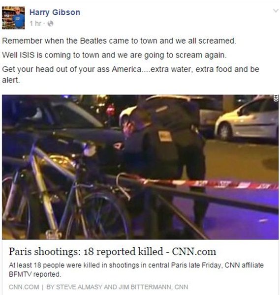 "Помните, как группа "Битлз" приезжала в город, и мы все визжали? Скоро в город приедет ИГИЛ, и мы снова будет визжать. Доставай свою голову из задницы, Америка. Готовь запасы воды, еды, и будь начеку", - Гарри Гибсон