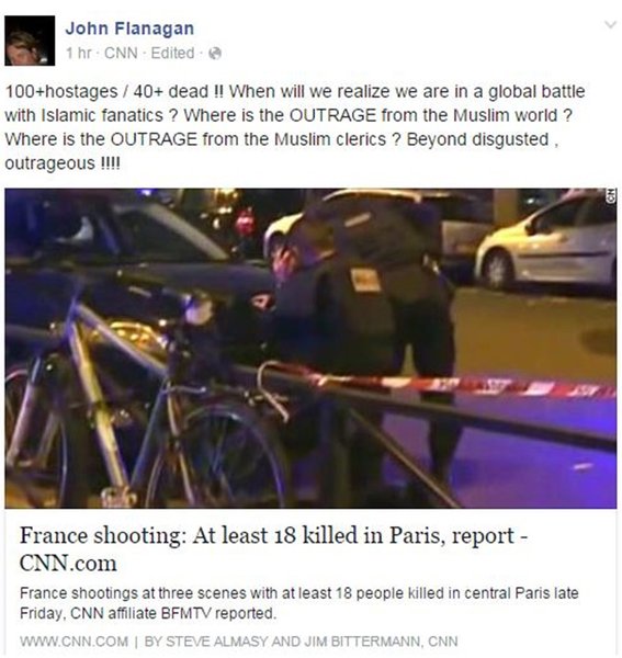 "100+ заложников/40+ убитых. Когда мы наконец осознаем, что мы участвуем в всемирной битве с исламскими фанатиками? Где возмущение мусульманского мира из-за случившегося? Где возмущение мусульманских священнослужителей? Я возмущен и переполнен отвращением!", - Джон Фленеган
