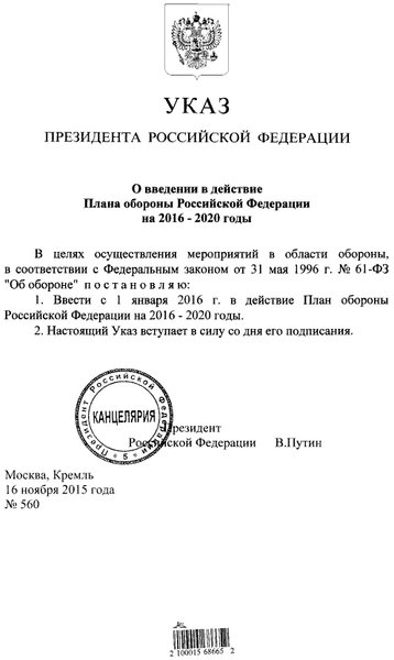 Президент России Владимир Путин подписал указ о введении в действие плана обороны Российской Федерации на 2016-2020 годы, сообщает портал правовой информации РФ.