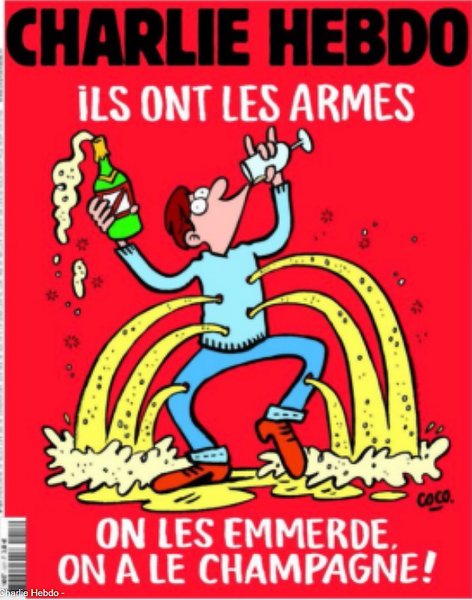 На рисунке изображен мужчина с бокалом и бутылкой шампанского в руках. Напиток выливается через пулевые отверстия в его теле. Под карикатурой также есть подпись: "У них есть оружие. Да пошли они, у нас есть шампанское".