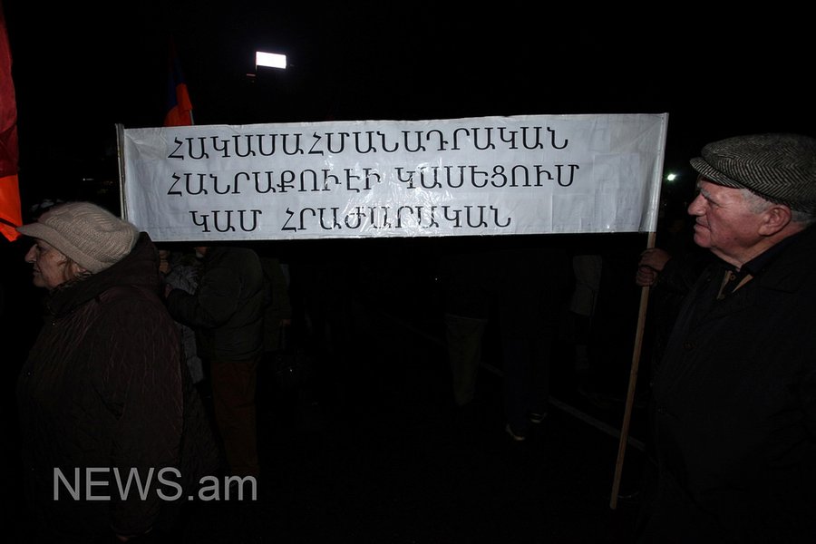 Движение "Новая Армения" начало круглосуточную сидячую демонстрацию на площади Свободы в Ереване. Об этом заявил лидер партии "Наследие" Раффи Ованнисян во вторник вечером по окончании шествия против конституционных реформ, передает местное издание news.am.