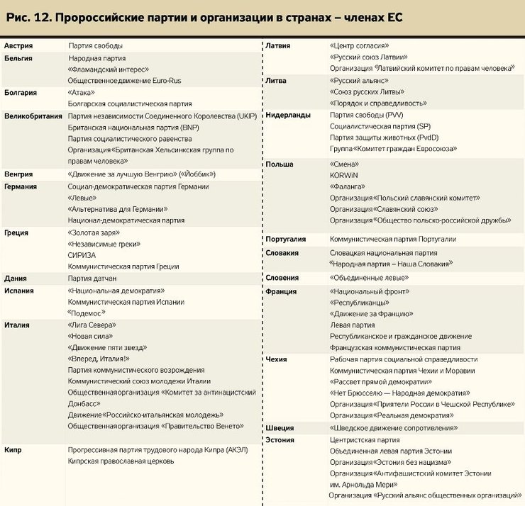 Среди парламентских партий откровенно пророссийских не так уж и много. И редко в какой стране они входят в многочисленные фракции в парламентах: французский "Национальный фронт" имеет в нижней палате два мандата, итальянская "Лига Севера" – 15, болгарская "Атака" – 15, бельгийский "Фламандский интерес" – 3.