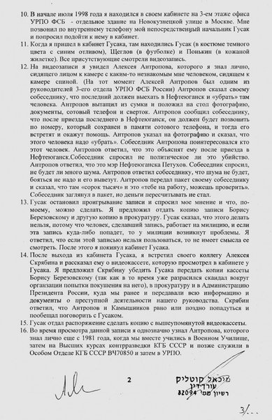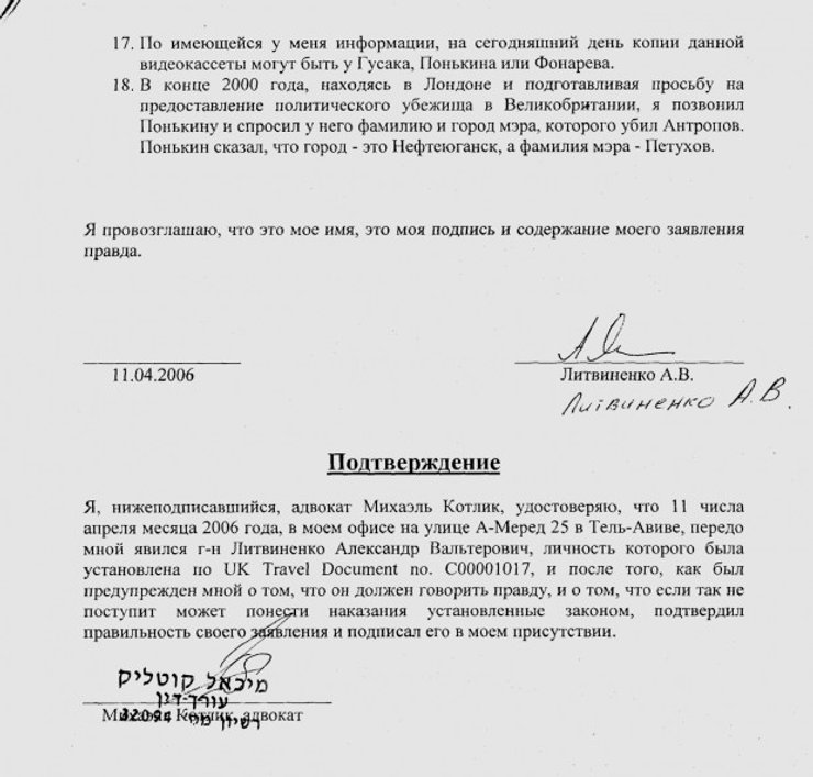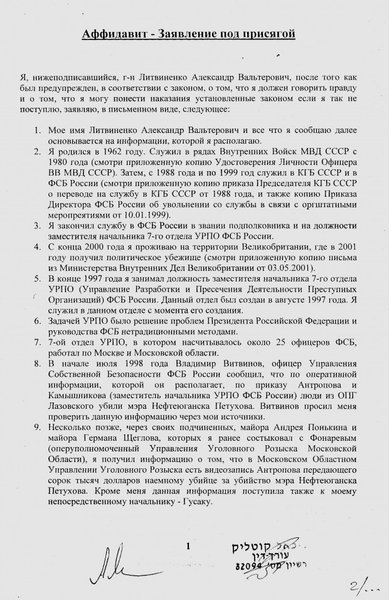 "У меня немного глаза на лоб вылезли, и я спросил: "А что еще ты знаешь?!". Литвиненко мне пояснил, что видел одну важную видеозапись, когда работал в ФСБ. Тогда я спросил Литвиненко, будет ли он готов сделать заявление под присягой. Он ответил: "Конечно". Мы пригласили Литвиненко в Тель-Авив, куда он приехал на пару дней. На встрече со мной и адвокатами Литвиненко рассказал подробно все, что знал. После чего с его слов был составлен документ, на русском и английском языках, который Литвиненко проверил, убедился в правильности абсолютно всех деталей и подписал", - цитирует Вольфа "Открытая Россия" и приводит скан документа.