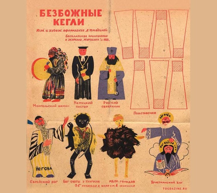 В детском журнале "Мурзилка" в №3 за 1932 была опубликована игра "Безбожные кегли", с помощью которой советская пропаганда пыталась привить детям отвращение к любым проявлением религиозности.