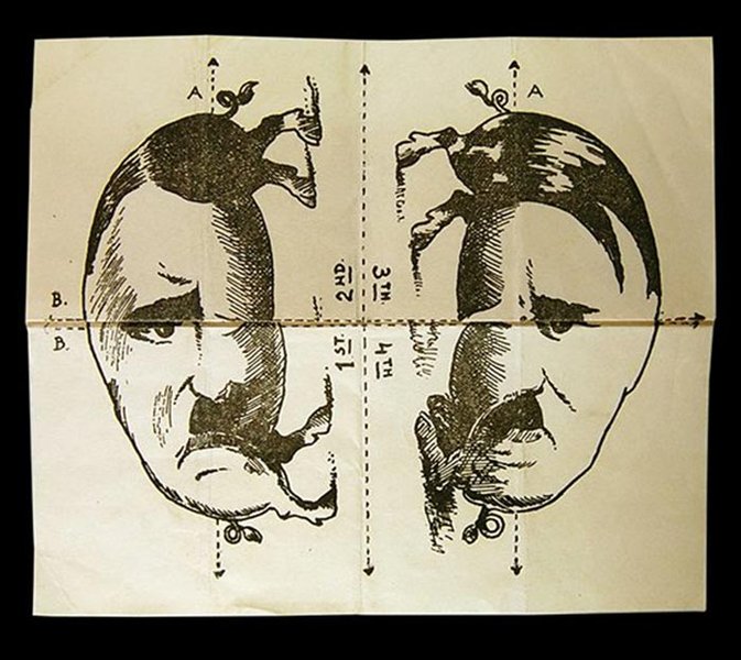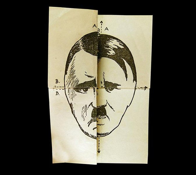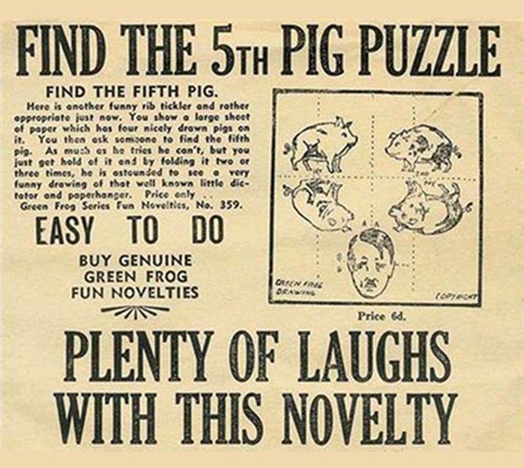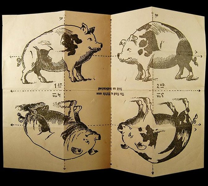 Головоломка под названием "Найди пятую свинью" распространялась в 1940 году в виде листовок в Великобритании и оккупированной немцами Западной Европе. Сгибаем бумагу по пунктирным линиям, складываем, как показано ниже, и получаем пятую, главную свинью.