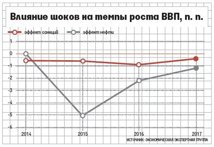 Эксперты центра отмечают, что влияние падения цены нефти и санкций не только суммируется, но и усиливает друг друга. Согласно расчетам, потери роста экономики за четыре года составят 8,4%, или 2,1% в год.