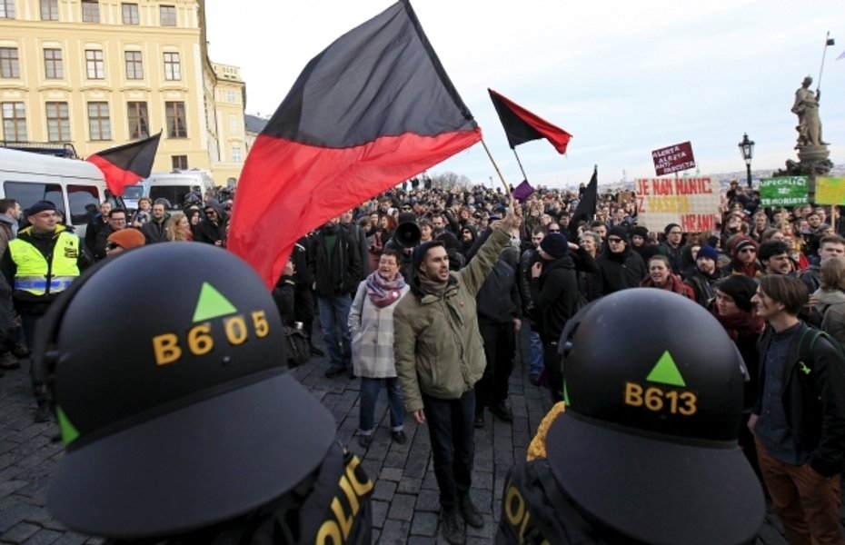 В столице Чехии противники иммиграции и их оппоненты забрасывали друг друга пустыми бутылками и фейерверками, полиции пришлось разводить два лагеря протестующих - около 1500 сторонников и 400 противников Pegida.