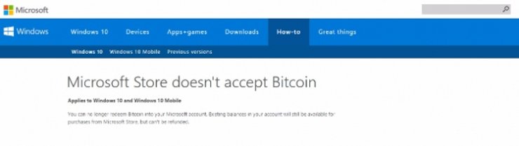 Корпорация Microsoft прекратила работу с криптовалютой биткоин. Специального объявления Microsoft не делала, но уже появилась страница в Windows Store FAQ, где говорится о том, что биткоины больше не принимаются, передают "Украинские новости".