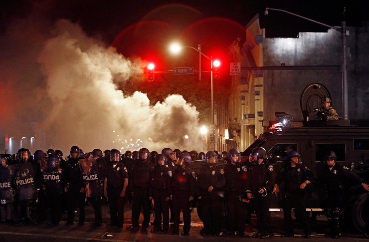 Фотограф: Каролин Коул, 2014. Во время беспорядков в Балтиморе (штат Мэриленд) полиция пытается разогнать представителей СМИ и местных жителей. 28 апреля 2014 года