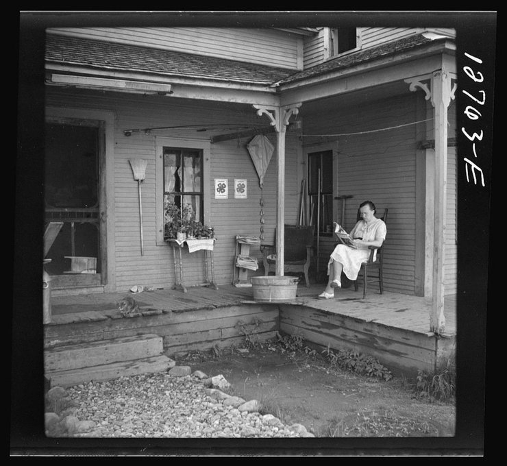 Фотограф: Луиза Росскам, 1940. Женщина сидит на своем крыльце в городе Линкольн (штат Вермонт). 1940 год