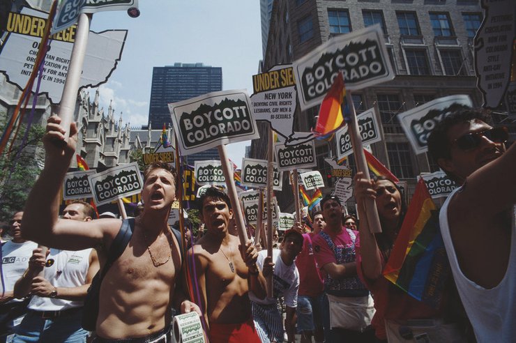 Фотограф: Барбара Альпер, 1994. Во время гей-парада в Нью-Йорке мужчины и женщины несут плакаты, на которых написано "Бойкот Колорадо". Июнь 1994 года