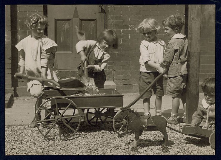 Фотограф: Джесси Тарбокс Билс, 1915. Пока малыши постарше грузят камни в тележку, самый маленький ребенок, сидя на земле, играет с крошечной повозкой и пони. 1915 год