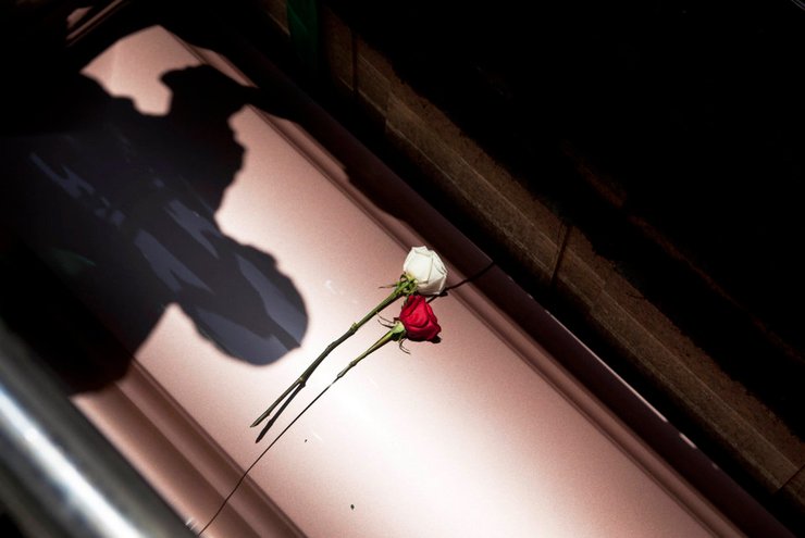 Фотограф: Кэти Фалькенберг, 2011. Тень кладбищенского сторожа Сэмми Трето, посвятившего этой работе всю жизнь, падает на гроб, когда он опускает его в землю после чтения молитвы в Атадене (штат Калифорния). 23 мая 2011 года