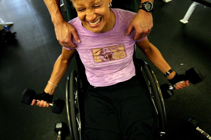 Фотограф: Лиз О. Байен, 2009. Сотрудницу полиции Лос-Анджелеса Кристину Рипатти подстрелили во время преследования подозреваемого. У нее парализована нижняя часть туловища. На этой фотографии Рипатто с помощью личного тренера Лу Сиделла разрабатывает мышцы. 10 сентября 2009 года