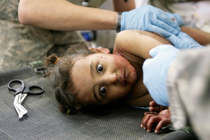 Фотограф: Майя Алеруззо, 2007. Раненый иракский ребенок получает первую медицинскую помощь на территории патрульной базы близ Багдада. Это одна из девочек, которые пострадали от минометного удара (Ирак). 11 декабря 2007 года
