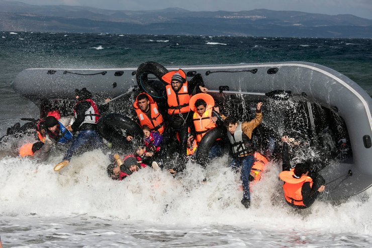 Фотограф: Паула Бронштейн, 2015. Беженцы, прибывшие на остров Лесбос, выпадают из опрокинувшейся лодки. 31 октября 2015 года