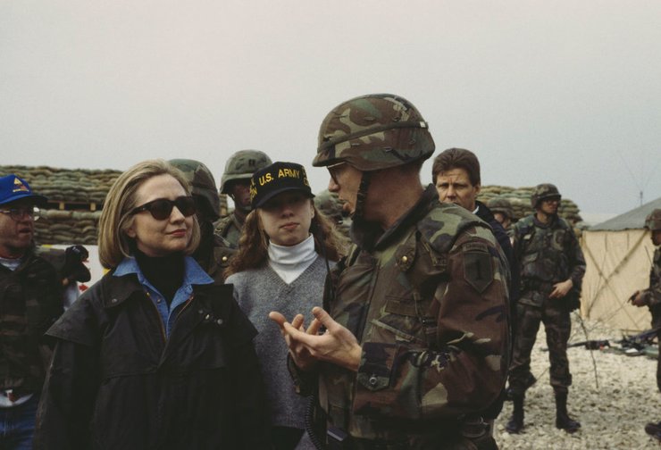 Фотограф: Джилл М. Догерти, 1996. Бывшая первая леди США Хиллари Клинтон вместе с дочерью Челси посетила американские войска, базирующиеся возле Тузлы, одного из самых больших военных аэропортов бывшей Югославии. Босния и Герцеговина, 25 марта 1996 года