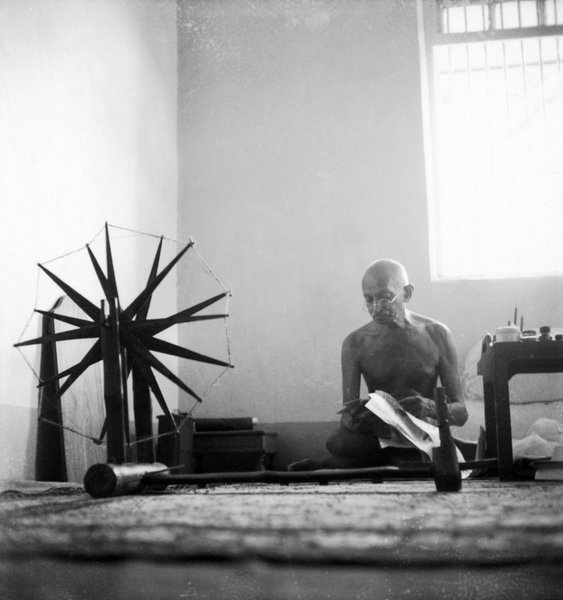 Фотограф: Маргарет Бурк-Уайт, 1946. Скрестив ноги, индийский лидер Махатма Ганди что-то читает. На переднем плане — прялка, символ борьбы Индии за независимость
