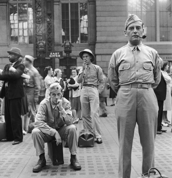Фотограф: Маджори Коллинз, 1942. Солдаты курят на железнодорожной станции. Август 1942 года