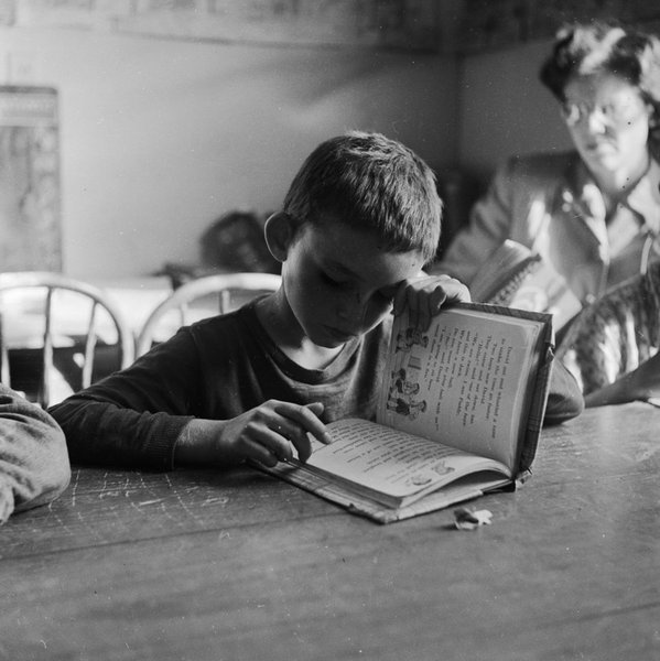 Фотограф: Дорин Спунер, 1951. Юный житель ранчо для мальчиков в Таскосе (штат Техас) под присмотром наставника учится читать. Ранчо было создано для того, чтобы дать парням из неблагополучных семей убежище и образование. Февраль 1951 года