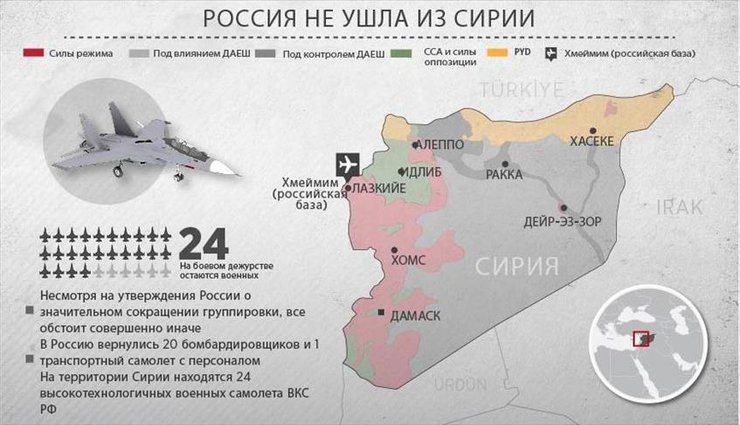 Несмотря на решение Кремля о выводе большей части российской группировки из Сирии, на подконтрольных режиму сирийского президента Башара Асада и Кремлю авиабазах продолжают пребывать 24 боевых самолета из РФ, сообщает со ссылкой на свои источники в Сирии турецкое агентство Anadolu.