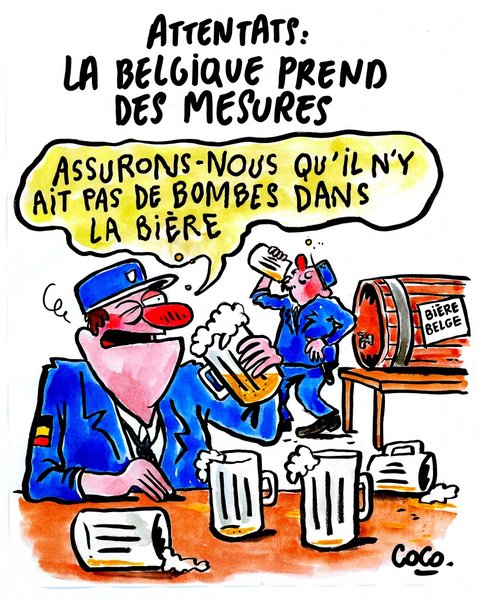 На иллюстрации изображены бельгийские полицейские, распивающие пиво. Один говорит другому: "Надо убедиться, что в пиве нет бомб".