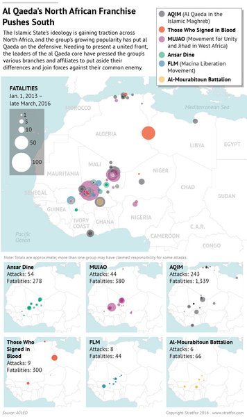 Именно этим можно объяснить последние нападения на слабозащищенные цели в городах Африки. В частности, с начала 2016 года, исламисты предприняли несколько нападений за пределами традиционной зоны активности, в том числе на Hotel Splendid в Буркина-Фасо и курорт Grand Bassam в Кот-д'Ивуар