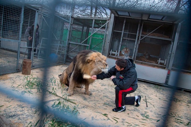 Перед выступлением дрессировщик Александр Лейси расчесывает гриву льва. Фотограф: Стефани Синклер, третье место в категории "Повседневная жизнь"