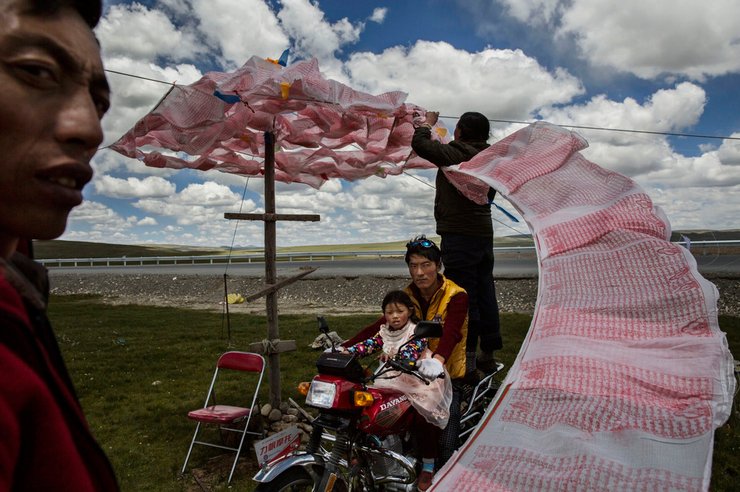 24 июля 2015 года в китайской провинции Цинхай, возле государственного общества по вопросам переселенцев, тибетские кочевники устанавливают буддистские молитвенные флаги. Фотограф: Кевин Фрэйер, победитель в категории "Люди"