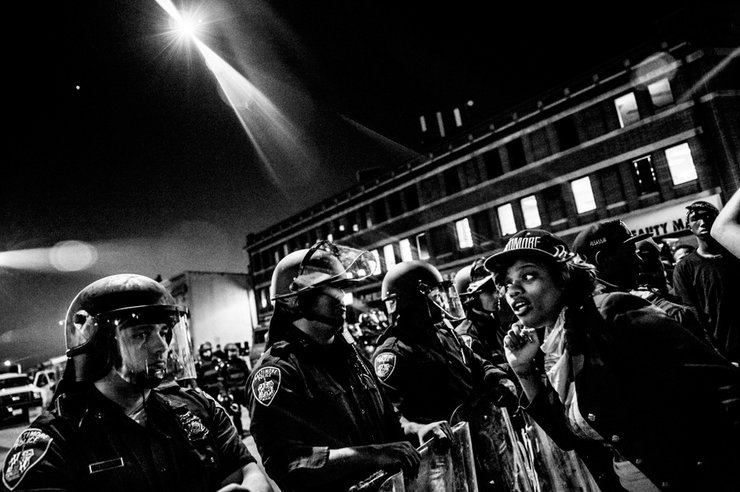 Женщина провоцирует полицейских. Вертолет направляет прожектор на протестующих и силовиков. Позже в тот же день от рук полицейских погибнет Фредди Грэй, 25-летний афроамериканец. Фотограф: Эндрю Бартон, третье место в категории "Текущие события"