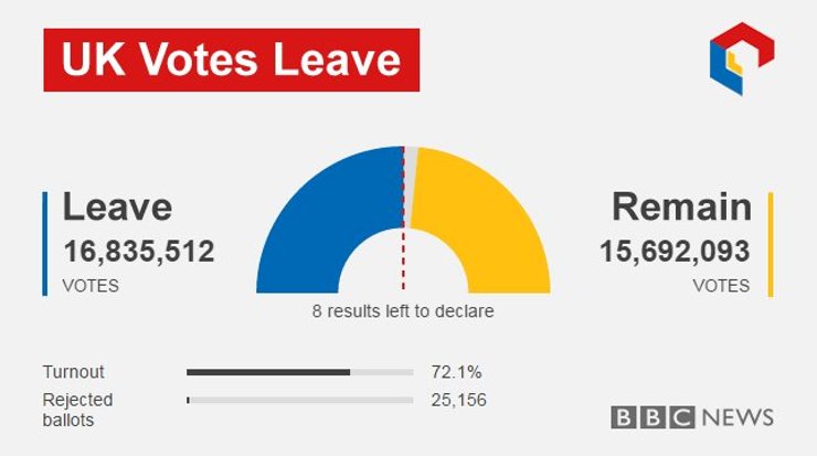 По итогам подсчета голосов по 374 из 382 избирательных округов, 16,8 миллионов избирателей проголосовали за выход из блока, 15,7 млн – за продолжение членства в ЕС. Таким образом, перевес в сторону противников Brexit уже математически невозможен.