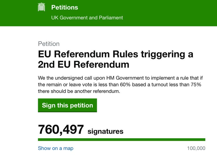 Текст петиции с призывом рассмотреть возможность проведения нового референдума о членстве Соединенного Королевства в Европейском Союзе, размещенный сторонниками евроинтеграции на сайте парламента Великобритании в первой половине дня 24 июня, уже подписали более 750 тыс. человек. Среди подписантов обращения к депутатам больше всего жителей Лондона.