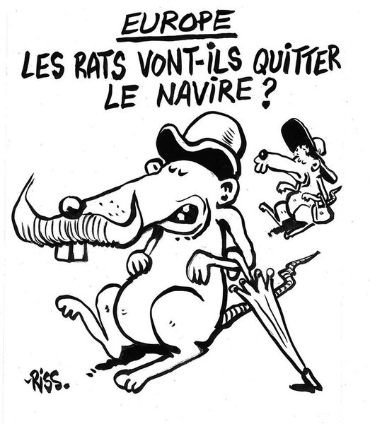 На третьей картинке – две антропоморфные крысы, во внешности которых отображены стереотипные представления о британцах – котелок, усы и зонтик. Подпись гласит: "Крысы бегут с тонущего корабля?"