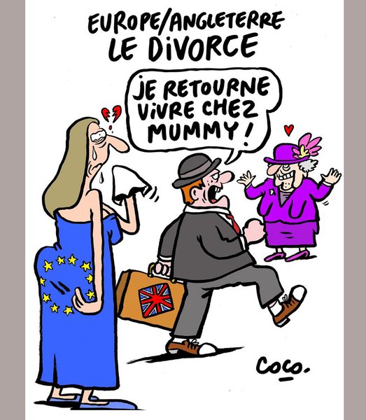 На другой карикатуре художники изобразили мужчину с чемоданом в руках, который говорит: "Я возвращаюсь жить к маме!". При этом он уходит от женщины в платье с символикой ЕС в сторону фигуры, похожей на Елизавету II. Картинку сопровождает подпись: "После 43 лет брака Англия решила развестись с Европой".