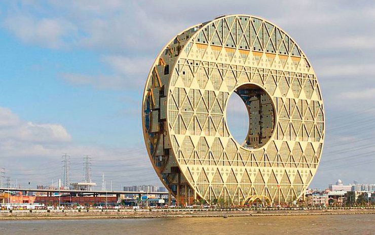 Пончики послужили вдохновением не только для кулинарных гурманов, но и для архитекторов. Уже несколько раз здания, не связанные с кулинарией, проектировались в форме пончика. Но бывало, что весь мир называл здание "пончиком", хотя к пышному десерту оно не имело никакого отношения. Одним из самых крупных архитектурных пышек является здание, построенное на берегу реки Чжуцзян в Гуанчжоу. Архитекторы планировали воспроизвести копию древнего китайского символа — дисковидного артефакта, сделанного из нефрита. Несмотря на все старания дизайнеров, в народе небоскреб получил название "Золотой пончик".