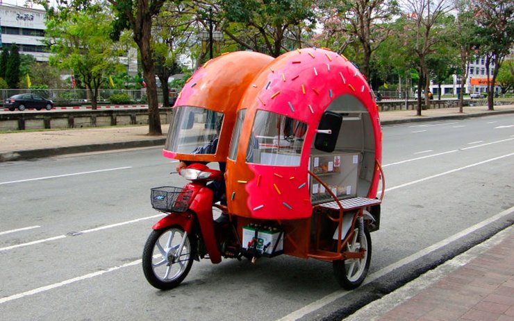Совершенно не обязательно иметь собственный ресторан, чтобы продавать в нем пончики. Есть куда более простые варианты реализации продукта. К примеру, по улицам Таиланда разъезжает мотоцикл с вот такой "сладкой" повозкой. Водитель транспорта одновременно является и продавцом магазина на колесах.
