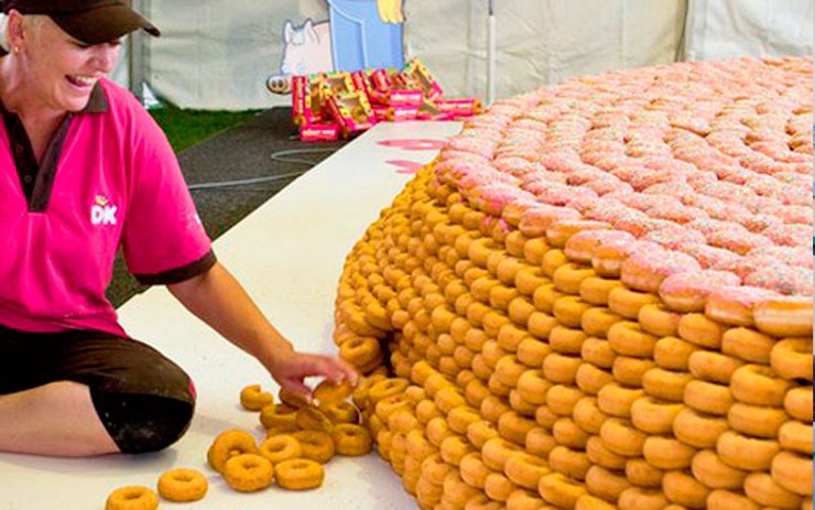 Кондитерской компанией DonutKing был создан огромный пончик, вес которого составлял 3,5 тонны. Гигант представлял собой 15 слоев из пончиков, аккуратно закрепленных друг на друге, политых глазурью и присыпанных карамелью. Для создания десерта, диаметр которого составлял 6 метров, понадобилось всего 9 часов и команда профессионалов. Гигантский пончик сразу же был занесен в Книгу рекордов Гиннесса.