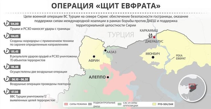 Согласно источникам в Генштабе ВС Турции, ВВС уничтожили 12 объектов террористов ИГИЛ. Еще 70 объектов уничтожены благодаря использованию реактивных систем залпового огня и артиллерии.