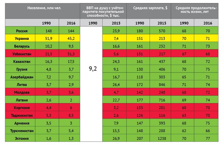 Мы решили посмотреть, как в бывших советских республиках с 1990 года выросли зарплаты и доходы, равно как и количество населения и продолжительность жизни.