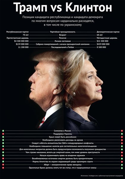 По последним опросам 54% сторонников Республиканской партии считают Трампа не лучшим партийным кандидатом. В целом по стране опросы стабильно отдают предпочтение Клинтон с разницей от пяти до десяти процентов. А специальная модель Upshot, прогнозирующая результат выборов, исходя из анализа множества факторов по всем штатам, сейчас предсказывает победу Клинтон с уверенностью в 89%. Но Трамп продолжает бороться за шанс возглавить страну.