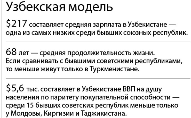 "На пути к достижению поставленных нами перед собой великих целей — построить свободное, демократическое государство, перейти к рыночной экономике, сформировать гражданское общество, войти в ряд развитых государств мира […] мы избрали единственно верный для нас путь, нацеленный на далекую перспективу, полностью соответствующий менталитету нашего народа, особенностям и условиям страны, получивший признание на международной арене как "узбекская модель" развития". Это слова самого Ислама Каримова, из недавнего.